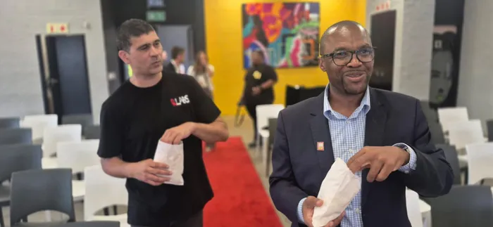 Marlon Parker co-founder of RLabs and Provincial MEC for Arts and Culture Ricardo Mackenzie, couldn't hold back the popcorn craving.
