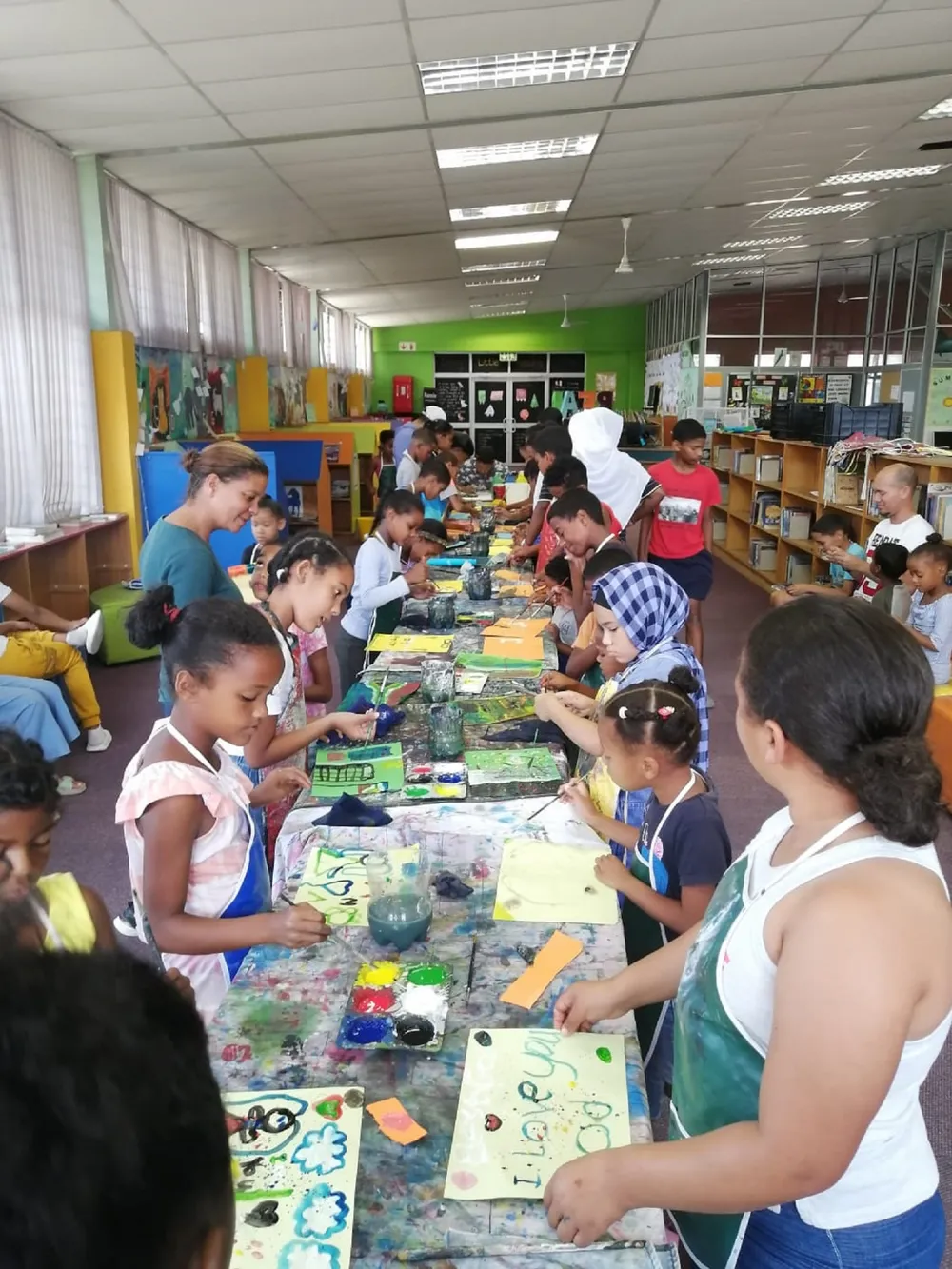 Budding artists have fun at Town Centre library. Pictured in front, seated on the right is artist Mark Jeneker, from Lentegeur.