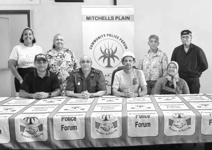 The Mitchell’s Plain Community Police Forum held its annual general meeting and executive committee election on Tuesday, January 21. Pictured in front from left are, vice chairperson Denzil Sampson, Mitchell’s Plain police chief, Brigadier Brian Muller, chairman Norman Jantjes, and project coordinator Jasmine Harris. In the back, from left, are assistant secretary Shihaam Johnstone, public relations officer Linda Jones, treasurer Charmaine Adams, and secretary Ben de Vos.