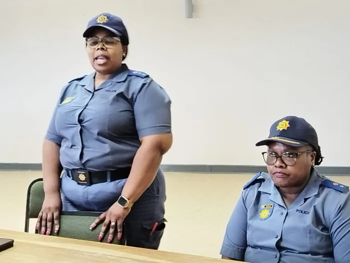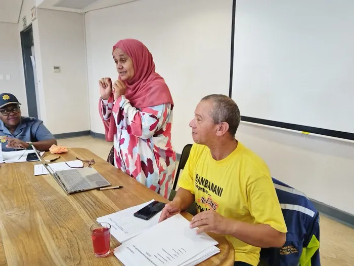 Aadielah Maker Diedericks presented a report about Eastridge on Saturday, February 14, at the Lentegeur police station, with Michael Jacobs looking on.