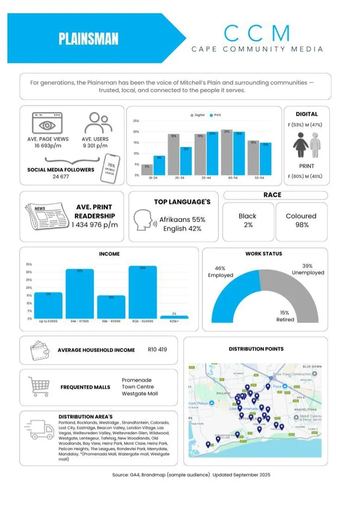 The Plainsman is a trusted and reliable news publisher that delivers free weekly trusted hyperlocal community school news, sport, entertainment & opinion to Mitchell’s Plain and nearby areas. This long established popular community title established in 1980 which includes the key shopping centres the Promenade Mall and Town Centre Shopping Centre within its distribution area. with specialised content units providing a breadth and a depth of content in verticals that include hyper-local expert newsroom updates, sport, entertainment and opinion.