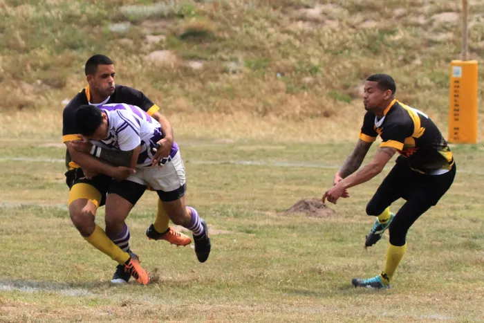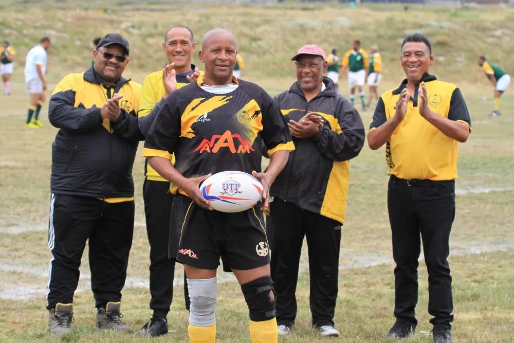 Rocklands RFC’s Brendon Miggels closes in on his opponent with teammate Kyle Lenders in support during their side’s match against Retreat. Rocklands RFC’s Chadley Benjamin launches an attack during his side’s match against Retreat, at the club’s 40th anniversary sports day, at the weekendRocklands’ Chadley Benjamin gains possession as teammate Ryan Crouse gets the ball away before going to ground during Saturday’s friendly outing against Retreat. Rocklands RFC veteran Tony Carolus, in front, and a few long-standing club members gather for a team photo during Saturday’s rugby festivities. Carolus is still an active player and has been with the club since its establishment in 1982 as are all the other members pictured here. Back row, from left, are, Raymond Lakay, William Omaticus, Arthur Swartz and Jeftha PetrusAshraf Daniels looks to spread the ball with Daniel Matanda coming up in support, during their sides’ match against Retreat.