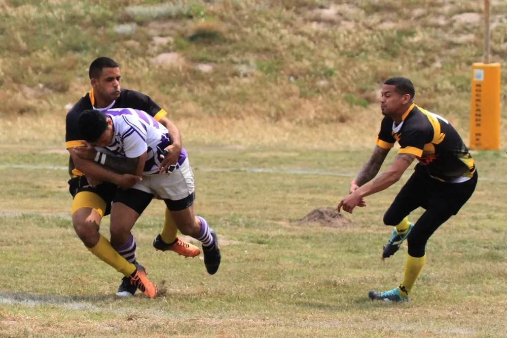 Rocklands RFC’s Brendon Miggels closes in on his opponent with teammate Kyle Lenders in support during their side’s match against Retreat.