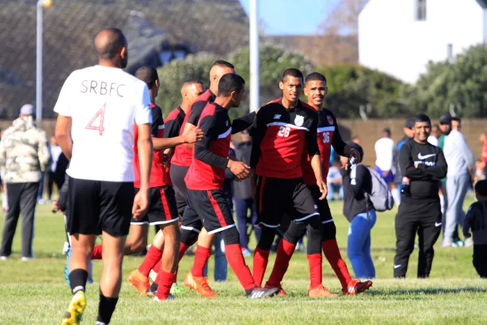 Westridge FC in celebratory mood following their 6-0 win against Salt River Blackpool, in a Coke Cup last round of 16 fixture, at the Rooikrans sports complex, in Grassy Park, at the weekend. Picture: Fuad Esack