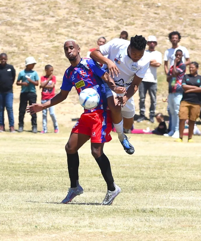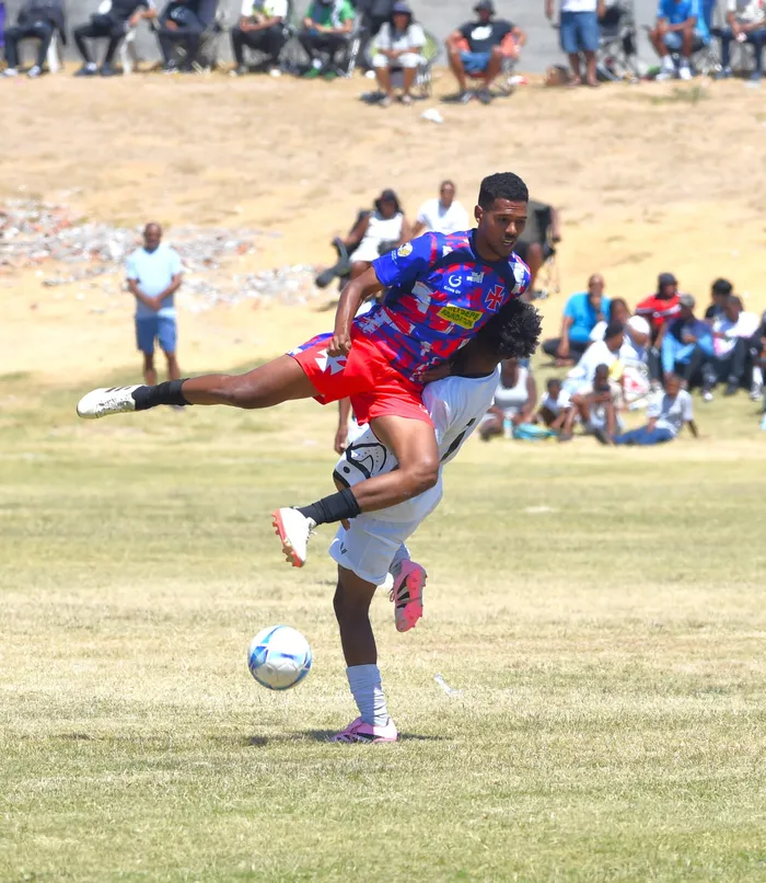 Chad Roman of Vasco da Gama goes into battle with Trinitarians' Roberto Collins during Sunday's Western Cape Nedbank Cup final, at the Uitsig sports complex.